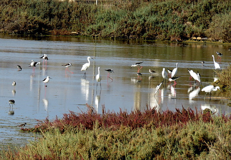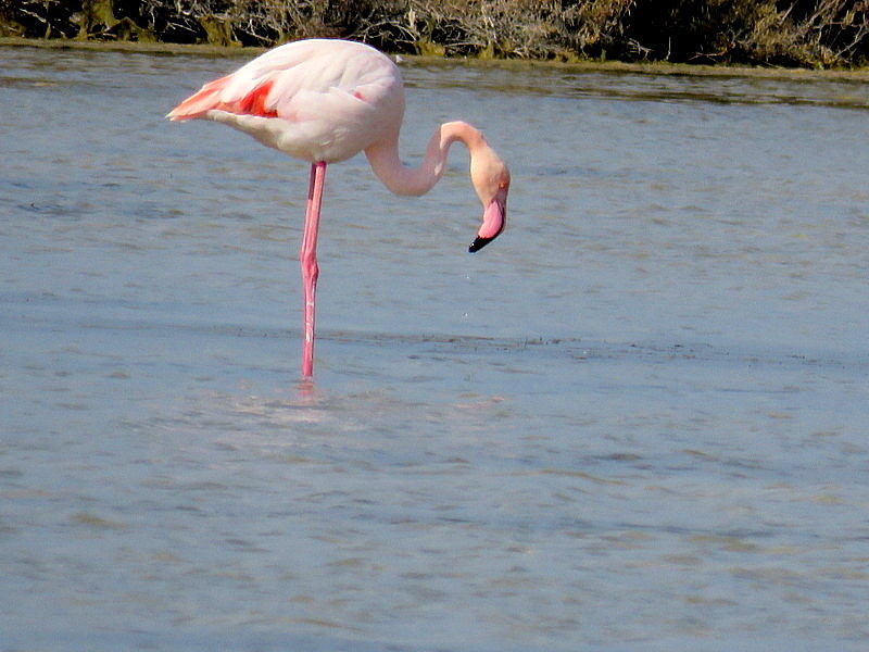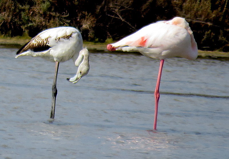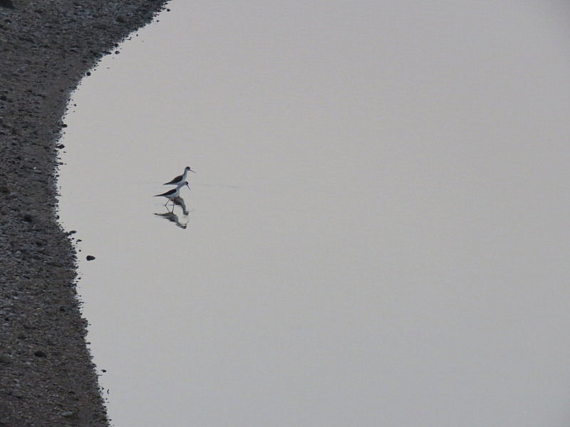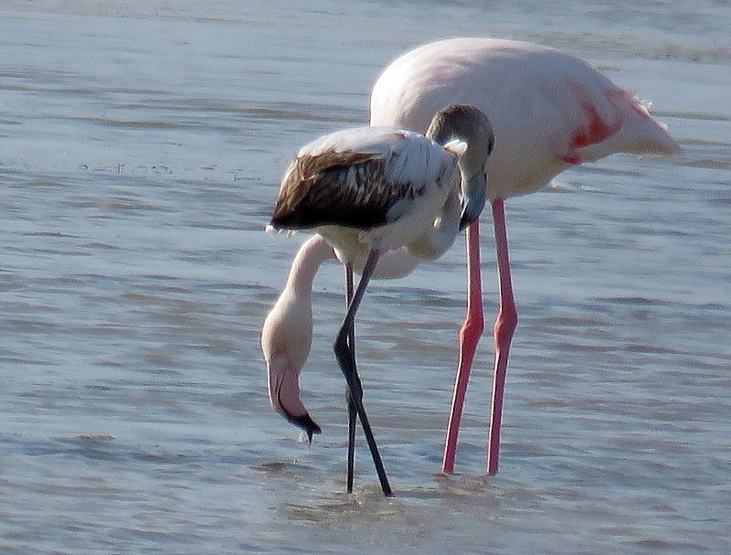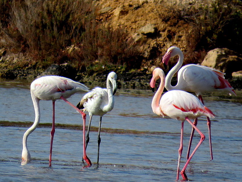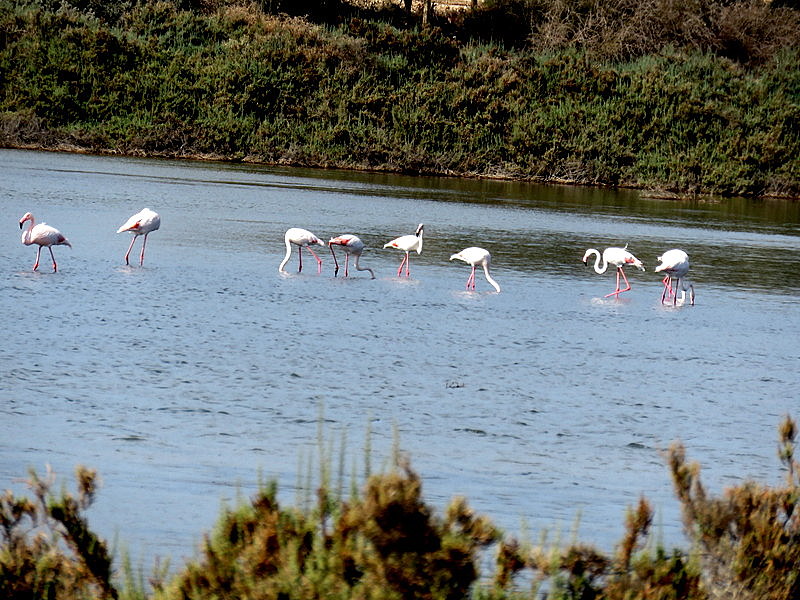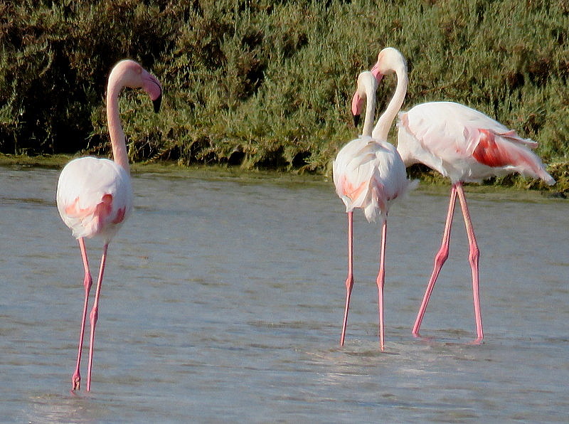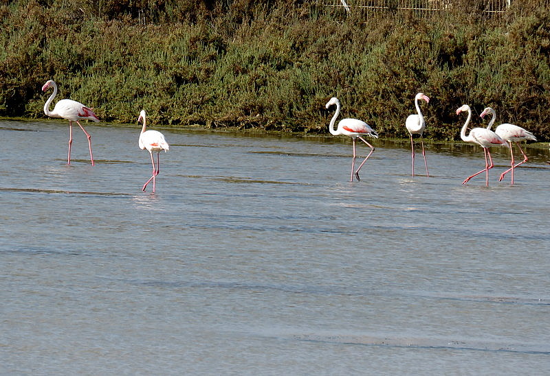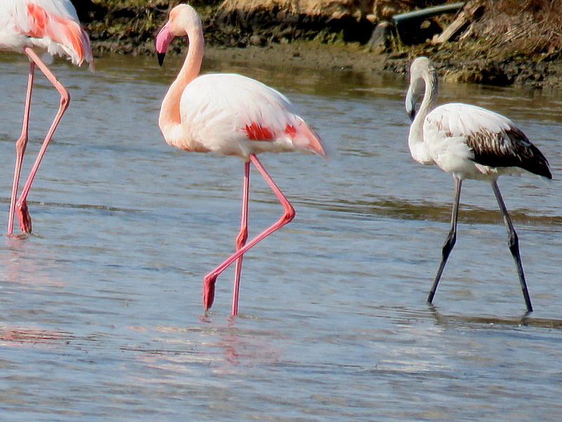 Эти птицы сегодня - гвоздь программы: они у нас на перелете, часто, но не всякий год залетают в наши края. Некая компания любителей природы вспугнула фламинго громкими голосами - птицы не взлетели, не скрылись. Они важно и чинно последовали на другой край пруда