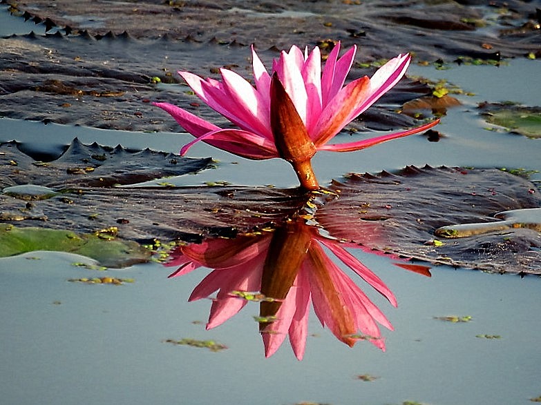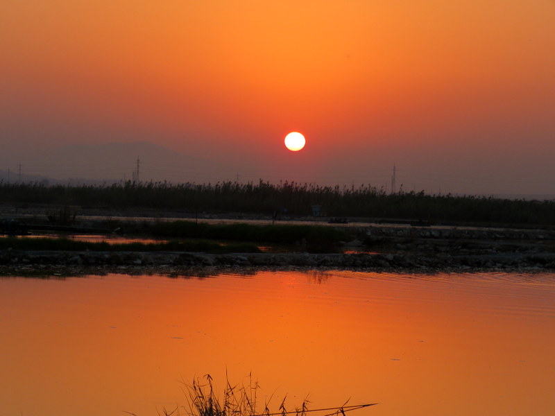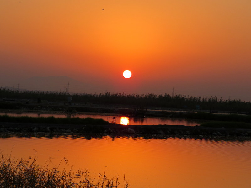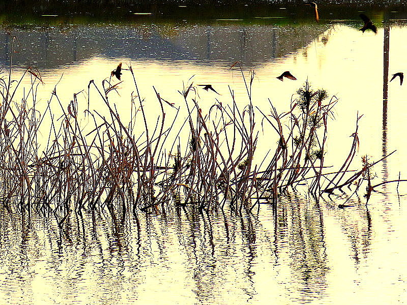 Поначалу, когда стало светать, все казалось серым и тусклым. Постепенно небо на горизонте стало розоветь, сначала узкой полоской, которая все выше и шире наполнялась всевозможными оттенками розового, вырастая и наполняясь, словно воздушный шар. Розовые блики рассвета, прикасаясь своими кистями к глади воды, окрашивали озера в коралловые тона. А потом выглянуло Светило - яркая дуга, полукруг, круг... Оранжево-красное Солнце словно всплывало, легко и непринужденно завоевывая небо и все пространство. Оно зажгло озера огненным цветом, осветило своим пламенным взглядом небеса. И птицы в вышине отсвечивали позолоченными солнцем крылами...