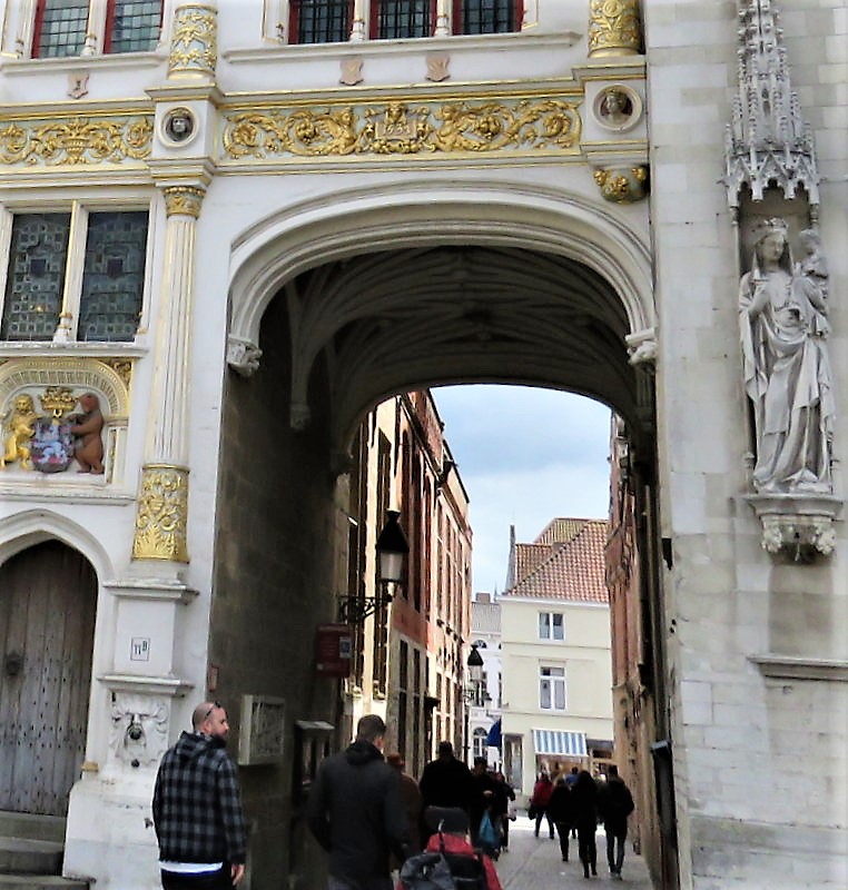 Арка в правой части здания ведёт на улицу Слепого Осла, по-фламандски Блинде Эзельстраат: