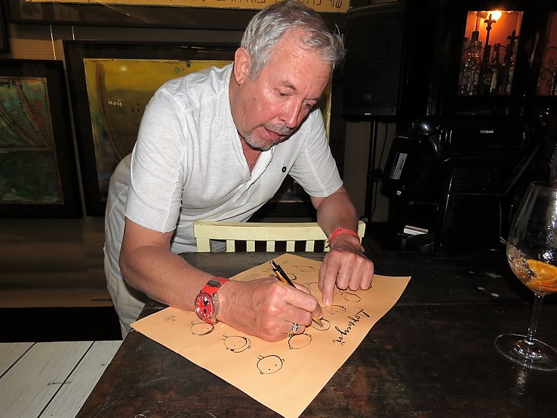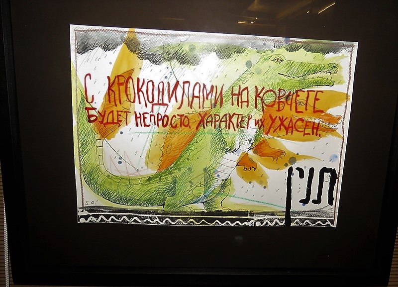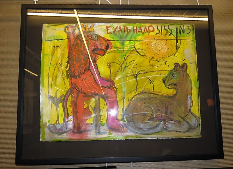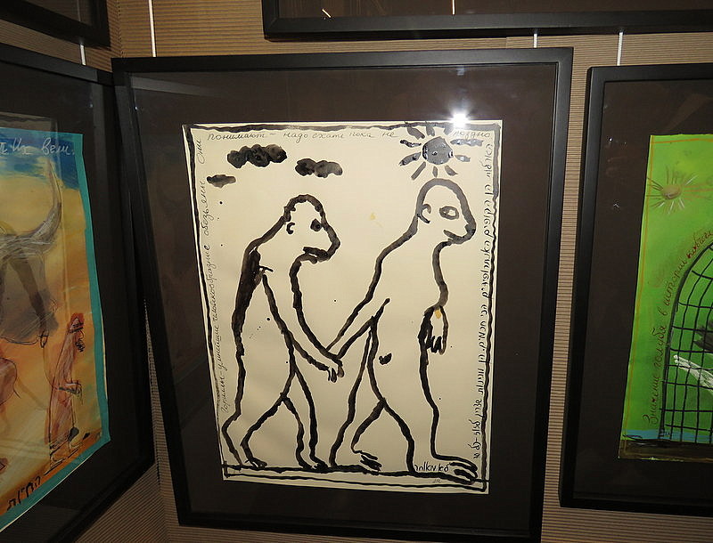 Андрей Макаревич тоже был веселым, много шутил. Можно и так сказать: игривым. Мне показалось даже, что он не вышел из образа задорного игрока, с коим выступает в затеянной с Сашей Галицким забаве. Они способны – в четыре руки – создать работу, похожую на рисунок дошколят, и проставить подписи под рисунками ученическим почерком, а некоторые работы написать на листах, словно вырванных из школьных тетрадей в линейку. Тот самый случай, когда "устами младенца глаголет истина"! Потому что работы эти, как бы "как курица лапой", полны смысла: и Ветхий завет напомнят, и историю, и осветят моменты, над которыми ты даже не задумывался. А еще - заставят посмеяться. Что было до потопа? Оказывается, допотопная швейная машинка! Свои портреты авторы разместили справа и слева от портрета свиньи. Олени размышляют, "чистые" ли они животные. "Ехать надо", - говорят твари, направляясь к ковчегу. А бараны не "бэкают" вовсе: "Бла-бла-бла", - ведут они диалог...