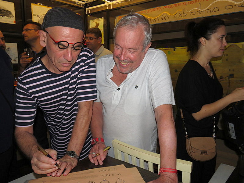 - Выставка интересная, живая, - говорит художник Сергей Бунков (на снимке - слева). - В каждой работе видна радость и экспрессия. Меня всегда удивляло, как можно работать вдвоём над одной работой, а здесь – целая выставка! Очень хочу, чтобы "Потоп" получил заслуженные положительную критику и большие продажи. А если отвлечься от самого события, то Израиль сегодня напоминает гору Арарат, куда пристал ковчег после потопа.