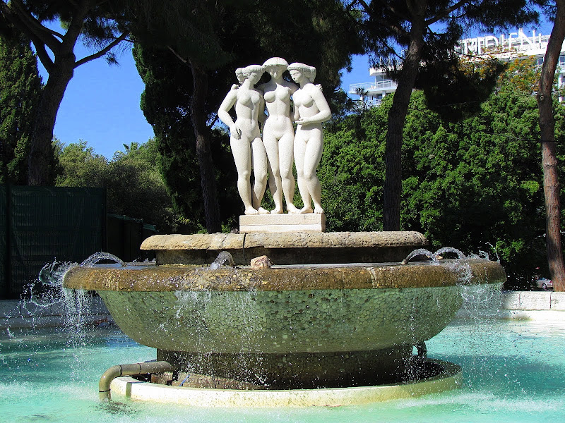 Наше знакомство с Ниццей началось с главного украшения площади - фонтана Солнечной системы, украшенного скульптурами работы Альфреда Жаньо (установлен в 1956 г.). За основу была взята идея Солнца, которое является основой олицетворения Ниццы. Солнце венчает архитектурный ансамбль фонтана в виде Аполлона, который возвышается над пятью бронзовыми фигурами, прославляющими пять планет: Землю, Марс, Меркурий, Сатурн и Венеру.