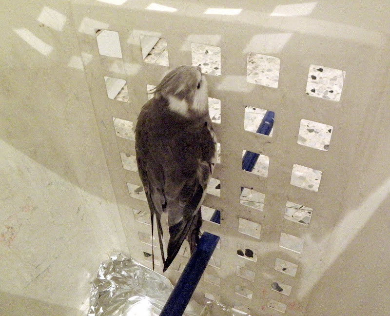 Пока что корзина с попугаем стоит в кухне. Подстилка (из фольги, надо поменять?) еще чистая, но лишний запах мне уже чудится (особенно – после недавнего эксперимента, о котором – в другой раз).
