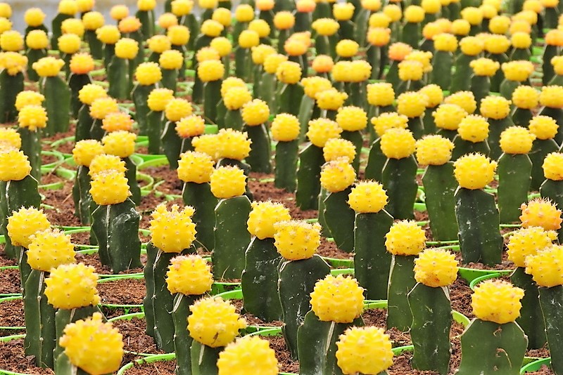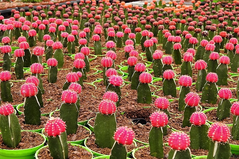 В 1940 году в Японии на сеянцах разновидности вида Gymnocalycium mihanovichii var. oliveti были замечены необычные мутации. В результате отбора были получены бесхлорофилльные красноокрашенные кактусы. Чаще всего встречаются бесхлорофилльные формы у разновидности Gymnocalycium mihanovichii var. friedrichiae. Так как эти кактусы лишены хлорофилла, они могут расти только привитыми на другом кактусе, подвое. В настоящее время получены другие бесхлорофилльные формы этого кактуса — жёлтая, розовая, бордовая, оранжевая, чёрная.