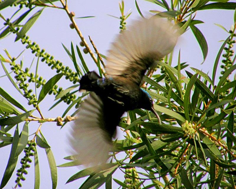 Обратите внимание на яркое пятнышко оперения под крылом птицы с перламутровым отливом. Вот из-за него этот вид нектарницы получил такое название: Красноподмышечная нектарница (Nectarinia Osea, צופית בוהקת), самец