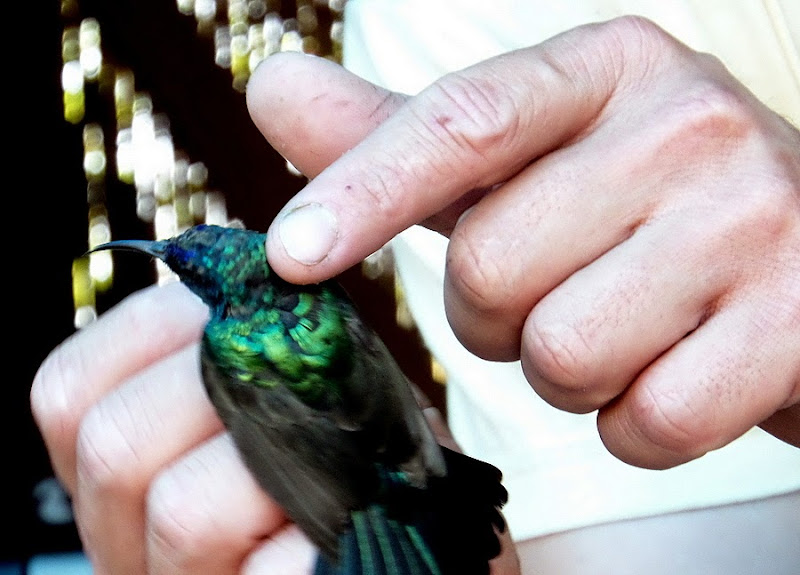 В ловушку попался еще один самец-нектарница. Орнитолог, даже сухую информацию преподносивший с любовью и нежностью к пернатым, по оперению на голове определил, что это — молодая птица, ее возраст примерно один год.